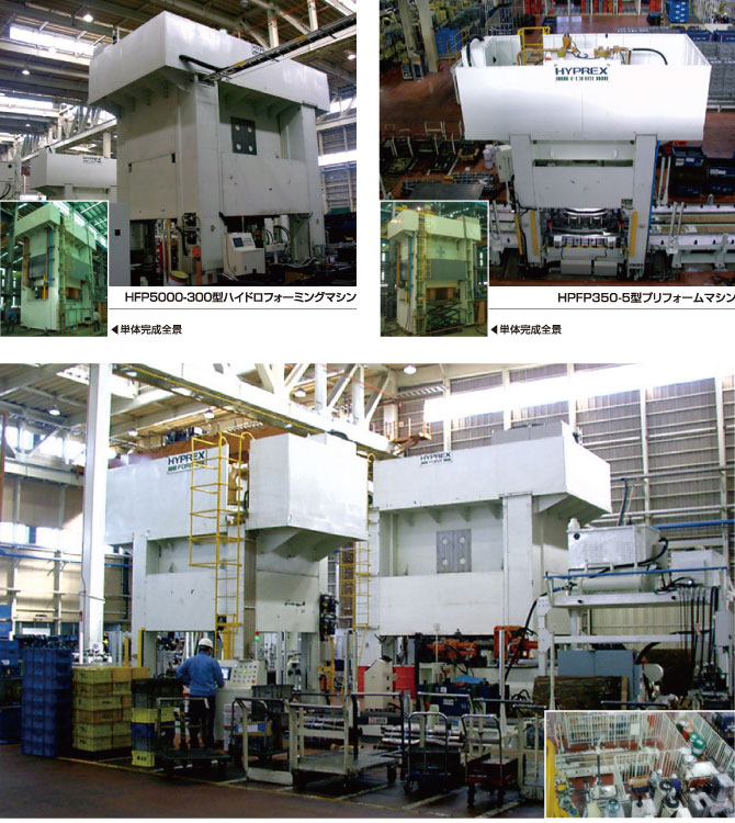 ・ハイドロフォ-ム機は、50000KNの型締力を持つ、サイドフレーム方式の液圧プレスで素材を両端より圧縮する軸押しシリンダー、Hydroforming加工に必要な高圧水供給装置、Hydraulic装置、金型交換台車及び電気系制御装置より構成されています。